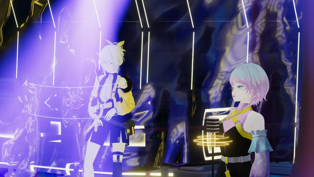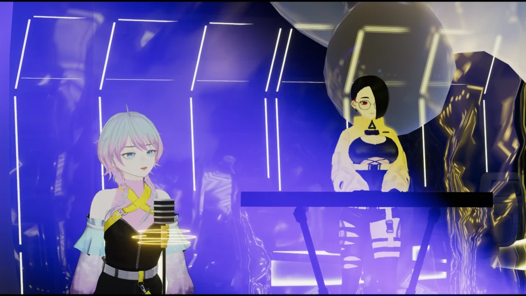 今回のライブや制作物の大きなテーマは、Cinematic Neon Club(以下CNC) エピソード0です。CNCの世界観として、最後に三人組としてまとまるように、演出プランを組みました。また、本ライブは全編モーション収録のため、ワールド化を予定していますので、公開の際は是非遊びに来てください!