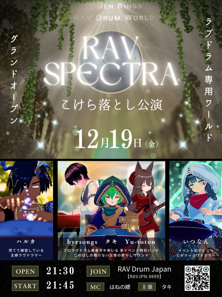 VRCで活躍しているRAV Vast Drum奏者3人が集まる今回のこけら落とし公演。同じ癒しの楽器でも三者三様の演奏。それぞれの考えるRAV Drumが聴こえてくる癒しのライブ。